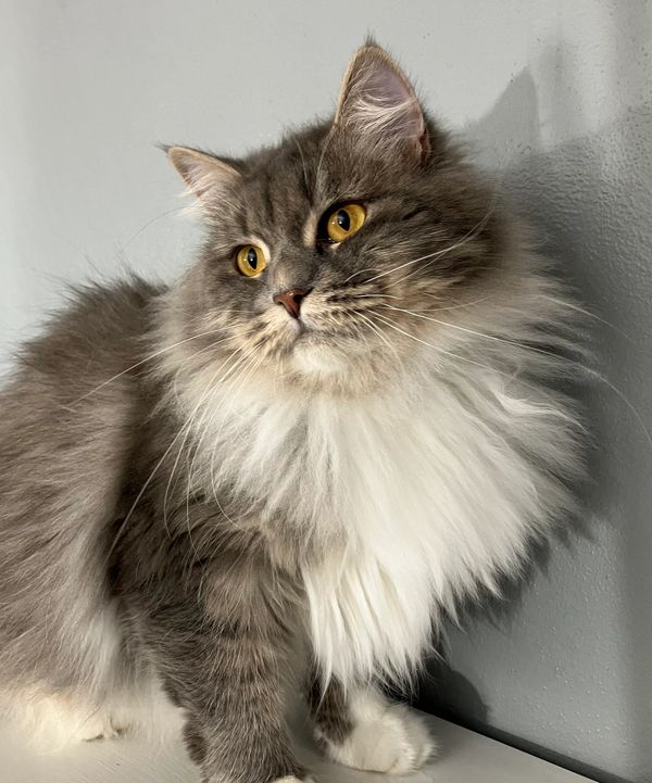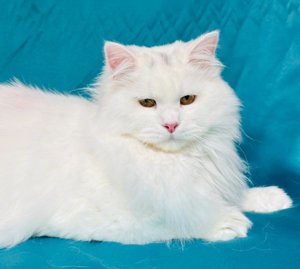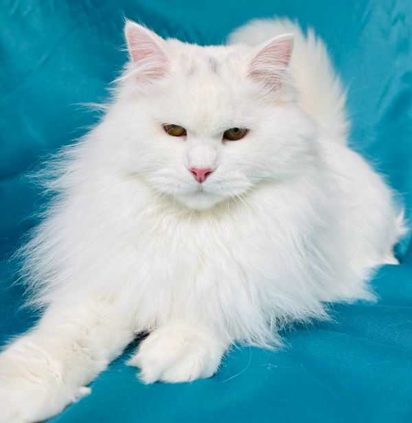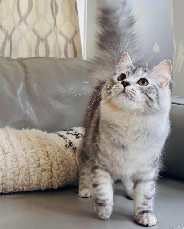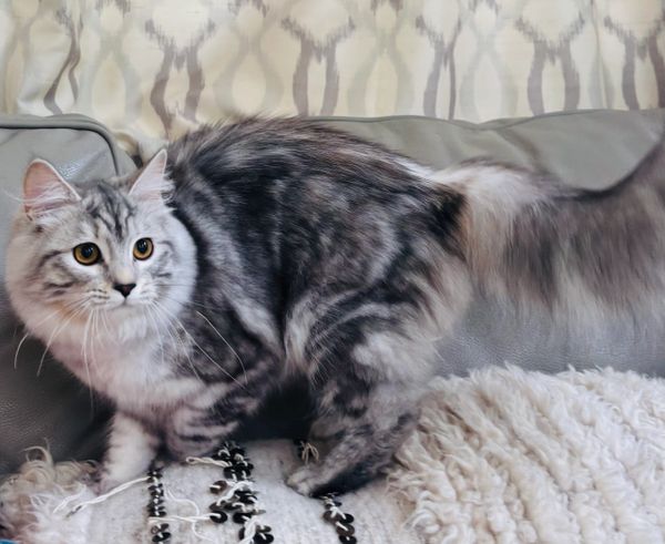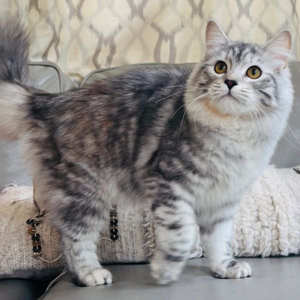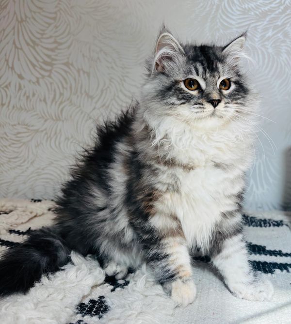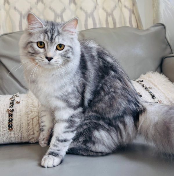 Barbie is registered with the WCF and TICA. Needless to say this Queen is spectacular. She knows she is a beauty queen; she loves to purr, be held; she is very social and calm; she is so very soft and silky. She integrates well with other friendly cats and children. She arrived to us via Russia in 2025, where she was already competing in WCF cat shows as a kitten. Her first cat show in the USA will be in Washington State in April 2025 with TICA.