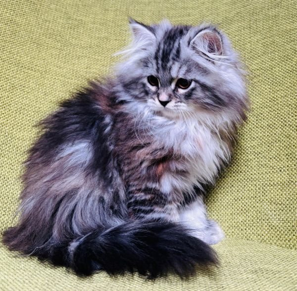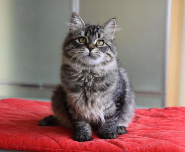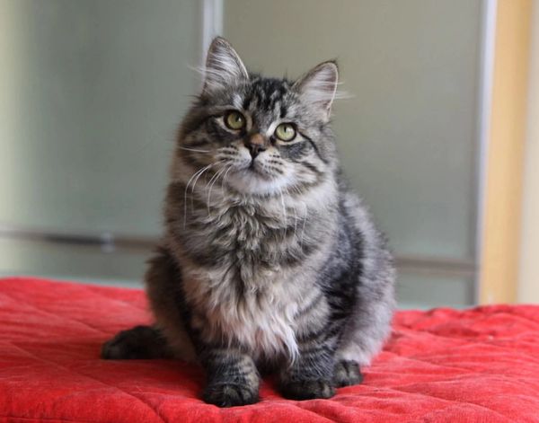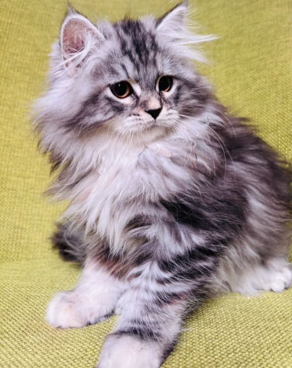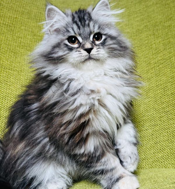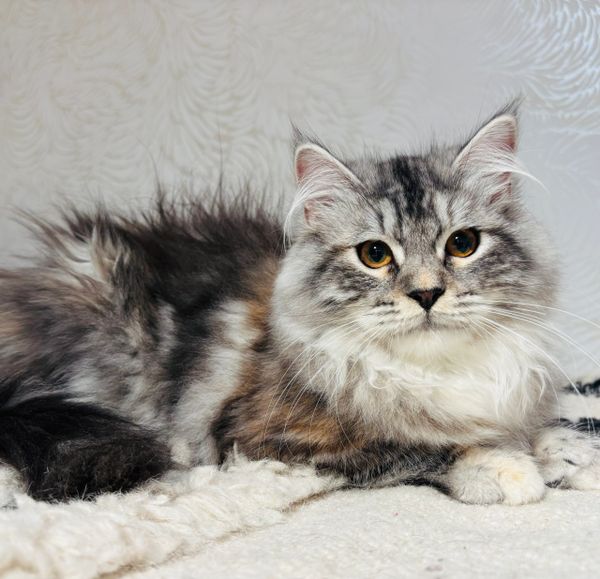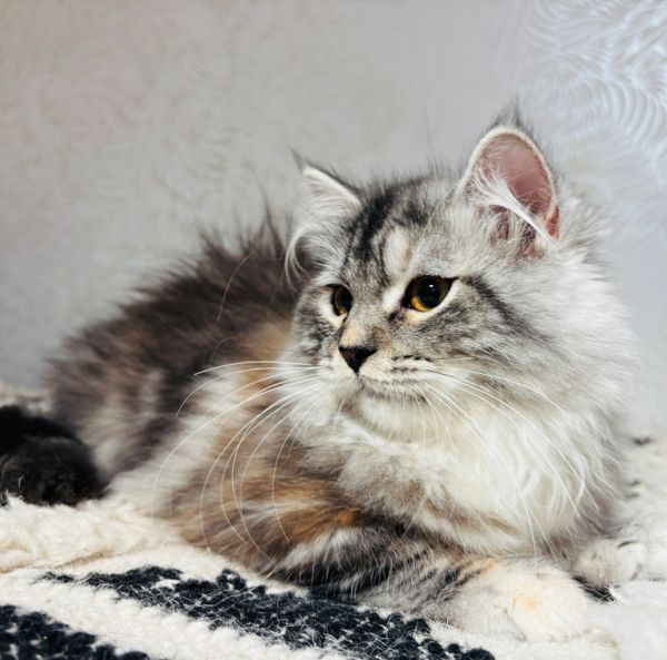 Elvira is registered with TICA. Elvira is the granddaughter of one of our most beloved Siberians - Zabava. Elvira is very social, extroverted, happy, loving and playful. Elvira has green eyes. She is a black silver mackerel torbie with white. Her genetics are unique - carrying silver, red, white and the Neva gene. Her coloring is rare in the Siberian breed.