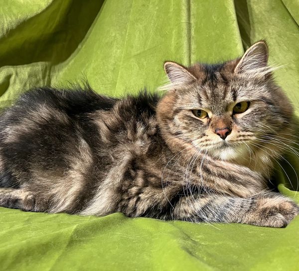 Greta is a kitten at heart. She is unable to control herself if there is a laser or feather wand around. She looks for other young Siberians to engage with her and chase her. She is a sweet girl that likes other cats and people. She is also a busy-body and likes to be active, always checking stuff out. Although she is dominantly sliver, she carries red, which allows her to birth a variety of kitten colors, depending on which King we pair her with.